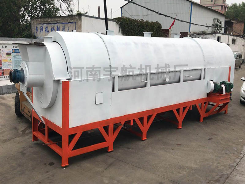3.炭化主機達到設定溫度后開始上料,首先進入預熱區(qū)把原料剩余水分烘干,之后進入炭化區(qū)炭化,炭化溫度控制在600℃左右,炭化過程中所產(chǎn)生的煙氣返回凈化系統(tǒng),凈化之后轉化為可燃氣循環(huán)燃燒,這樣利用自體產(chǎn)生的煙氣燃燒自體,滿足炭化機炭化時所需熱能連續(xù)生產(chǎn),達到環(huán)保節(jié)能的效果;